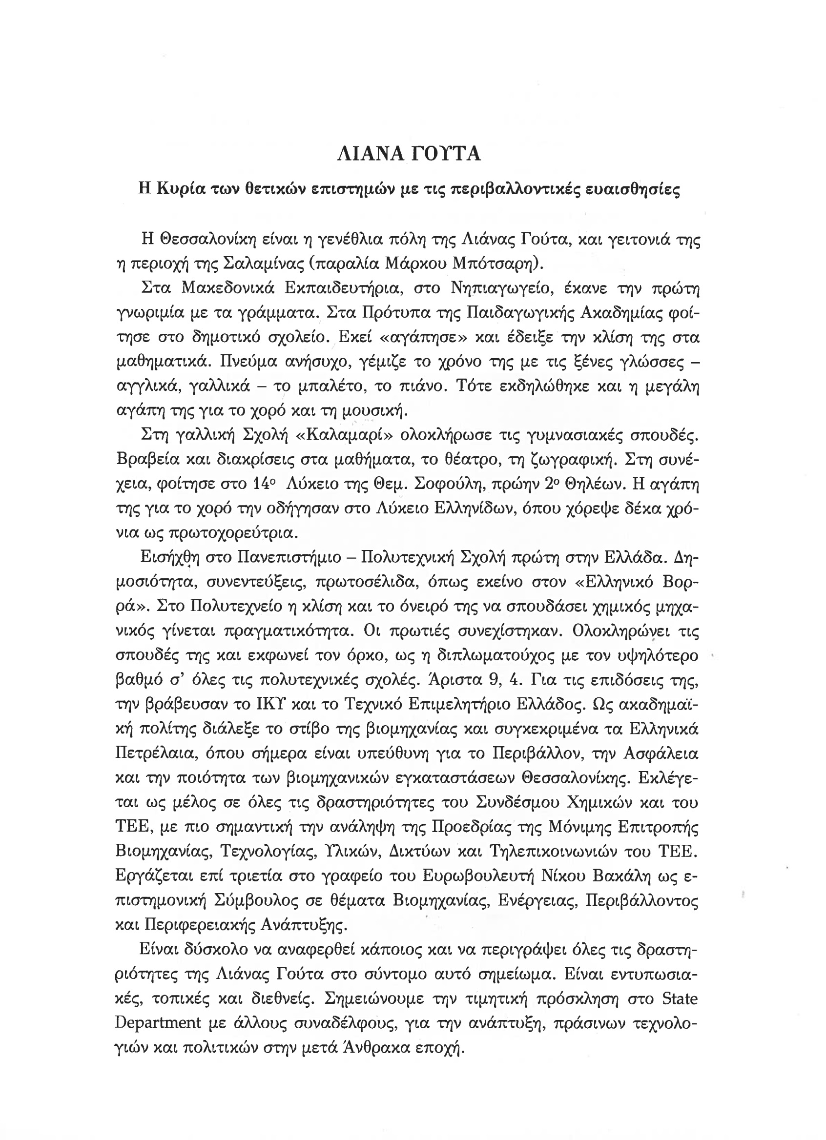 Σελ 89-94, "Λιάνα Γούτα, η Κυρία των Θετικών Επιστημών με τις περιβαλλοντικές ευαισθησίες",