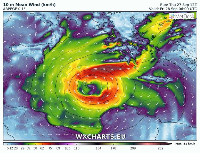 Long sea track for #Medicane #Zorbas squeezing north of Crete and into the Aegean Sea. Arpege has this cyclone as an equvalent category 1 hurricane at peak intensity --> http://wxcharts.eu/?panel=default&model=arpege,arpege,arpege,arpege®ion=float&chart=wind10mkph,850temp,wind10mkph,snowdepth&run=12&step=046&plottype=10&lat=51.500&lon=-0.250&skewtstep=0 …