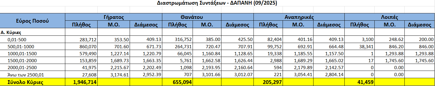 Όπως επισημαίνεται στην Έκθεση, τον περασμένο Σεπτέμβριο πληρώθηκαν συνολικά 4.708.355 συντάξεις, από τις οποίες οι 2.883.438 ήταν κύριες, οι 1.386.281 επικουρικές και 438.636 μερίσματα. Η μηνιαία δαπάνη που κατέβαλλαν τα ταμεία ανήλθε σε 2.759.351.960,73€ και περιλαμβάνει τις κρατήσεις φόρου, τις κρατήσεις υπέρ υγείας και ΑΚΑΓΕ.