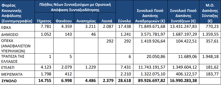 Αντίστοιχα, η συνολική δαπάνη των αναδρομικών στους νέους συνταξιούχους με τροποποιητική απόφαση συνταξιοδότησης ανέρχεται σε 14.458.572,89€ και η συνολική δαπάνη συντάξεων σε 6.275.776,15€ για την πληρωμή 6.790 τροποποιητικών συντάξεων.