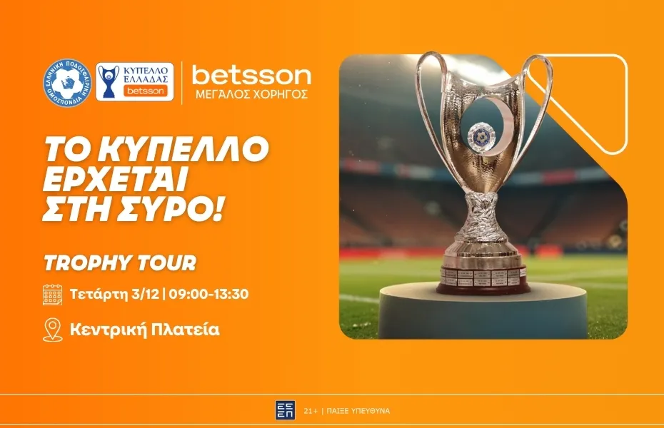 Μετά τις δύο πρώτες εντυπωσιακές στάσεις σε Λάρισα και Αγρίνιο, το Trophy Tour του Κυπέλλου Ελλάδας Betsson συνεχίζει το ταξίδι του και φτάνει στο κέντρο του Αιγαίου, με επόμενο προορισμό τη Σύρο.